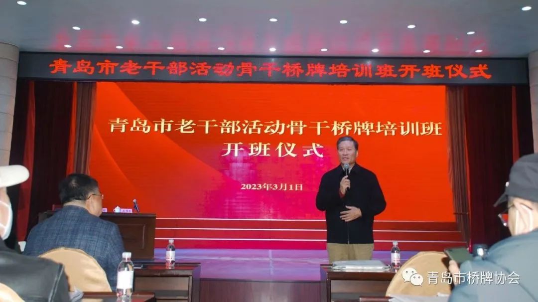 2023年3月1日,青島市市直單位老干部橋牌骨干培訓班開班儀式在青島市老干部活動中心舉行,青島市橋牌協會會長李春山致辭,山東省人大常委會原副主任夏耕出席并講話,近70位老干部橋牌愛好者參加活動,青島市委老干部局一級調研員、青島市老干部活動中心主任趙作發主持開班儀式。