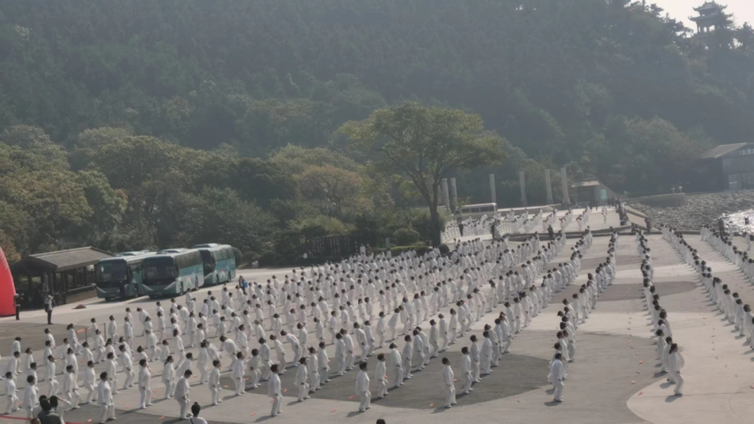 來自嶗山區127個社區近1300位太極拳愛好者齊聚道教圣地,展示了健身氣功《八段錦》、簡化太極拳24式、陳式太極拳精要十八式、太極功夫扇。