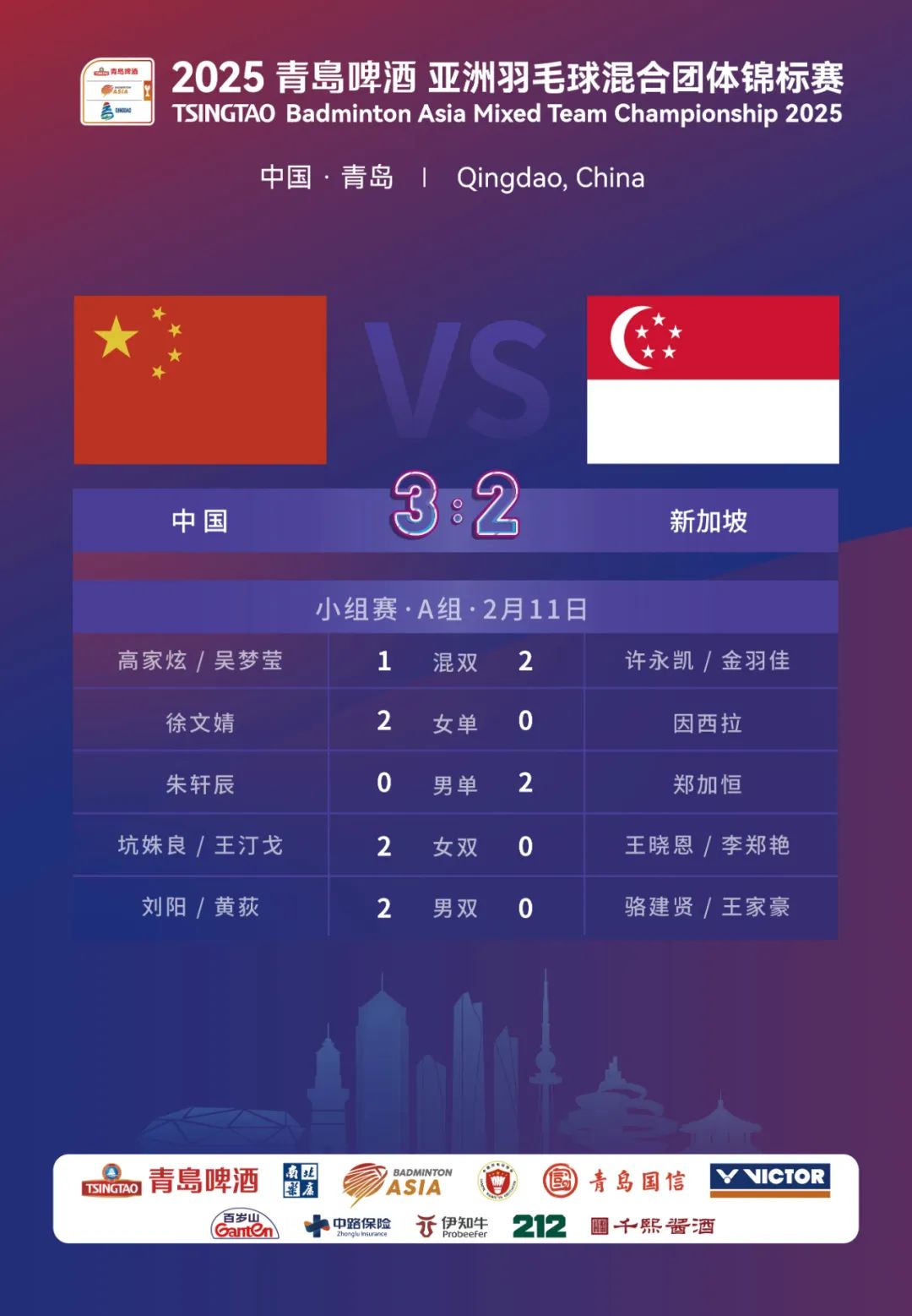 2025青島啤酒亞洲羽毛球混合團體錦標賽周二在青島國信體育館正式拉開戰幕,中國隊首秀在陳雨菲和陳清晨兩位奧運冠軍休戰的情況下,憑借年輕選手敢打敢拼,以3比2逆轉新加坡隊,贏得開門紅。