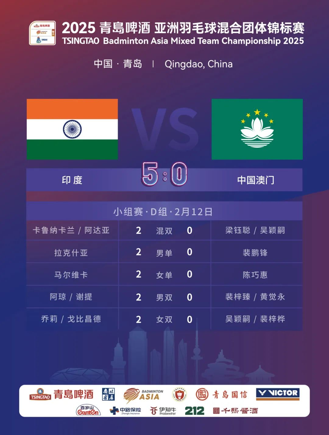 2月12日,2025青島啤酒亞洲羽毛球混合團(tuán)體錦標(biāo)賽結(jié)束了小組賽第二比賽日的爭奪,中國香港隊(duì)和中華臺北隊(duì)都經(jīng)過鏖戰(zhàn),分別以總分3-2和4-1擊敗馬來西亞隊(duì)和新加坡隊(duì),贏得各自首勝。兩戰(zhàn)皆負(fù)的新加坡隊(duì)無緣出線。印度隊(duì)和泰國隊(duì)則先后在首秀中完勝中國澳門隊(duì)和哈薩克斯坦隊(duì),顯示出良好的競技狀態(tài)。